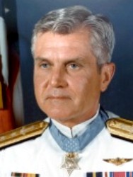 James Stockdale graduated from the U.S. Naval Academy at Annapolis, Class of 1947. His cousin, Robert Dunlap, earned the Medal of Honor in World War II. On August 4, 1964, Squadron Commander Stockdale was one of the U.S. pilots flying overhead during the second alleged attack of the Gulf of Tonkin Incident. On a mission over North Vietnam on September 9, 1965, Stockdale ejected from his A-4E Skyhawk, which had been disabled from anti-aircraft fire. He was interred as a Prisoner of War in North Vietnam until his release on February 12, 1973. Debilitated by his captivity and mistreatment, Stockdale could hardly walk or even stand upright upon his return to the United States, which prevented his return to active flying status. Out of respect for his courage, and out of high regard for his intellect, the Navy kept him on the active list, steadily promoting him over the next few years before permitting him to retire as a Vice Admiral. In 1992 he was the Vice Presidential candidate for Third Party candidate H. Ross Perot.