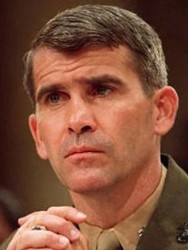 The President of the United States of America takes pleasure in presenting the Silver Star to Second Lieutenant Oliver Laurence North (MCSN: 0-106162), United States Marine Corps, for conspicuous gallantry and intrepidity in action while serving as a Platoon Commander with Company K, Third Battalion, Third Marines, THIRD Marine Division in connection with combat operations against the enemy in the Republic of Vietnam. On 25 May 1969, while Company K was participating in Operation Virginia Ridge near the Demilitarized Zone, the lead platoon came under a heavy volume of machine gun and automatic weapons fire supported by rocket-propelled grenades, directional mines, and mortars. In the initial burst of fire, the platoon commander and point squad leader were seriously wounded. Realizing the need for immediate action, Second Lieutenant North rapidly maneuvered his Second Platoon through the lines of the beleaguered unit and personally initiated an aggressive assault against the North Vietnamese Army emplacement, the momentum of which forced the stunned hostile soldiers to withdraw to another hill and enabled the treatment and evacuation of Marine casualties. After regrouping his forces, he fearlessly led an attack on the enemy’s new position, killing one soldier as his men closed with the enemy, and causing the North Vietnamese Army force to retreat to previously prepared entrenchments on the ridgeline. Again reorganizing his men, Second Lieutenant North, with complete disregard for his own safety, assumed the foremost assault position and seemingly oblivious to the intense machine gun fire impacting around him, led his men against the hostile position. As the tempo of the battle increased, casualties mounted, and his unit’s ammunition supply became short. Unwilling to unnecessarily risk the lives of his men, he halted the attack and, repeatedly exposing himself to the heavy volume of fire delivered by the determined enemy soldiers, boldly directed the resupply of his platoon and the evacuation of the injured Marines. After skillfully adjusting fixed wing air strikes upon the North Vietnamese Army unit, Second Lieutenant North dauntlessly initiated a fourth assault by his wearied men. Calmly braving the intense fire of the tenacious hostile soldiers, he moved from one Marine to another, directing their fire and exciting them to a last bold effort which, by his valorous perseverance, enabled his men to push the remainder of the North Vietnamese Army force from the ridgeline and to seize the objective. His heroic actions and vigorous efforts inspired all who observed him and contributed significantly to the defeat of the enemy. By his courage, dynamic leadership and unwavering devotion to duty in the face of grave personal danger, Second Lieutenant North upheld the highest traditions of the Marine Corps and of the United States Naval Service.