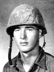 The President of the United States of America takes pride in presenting the Navy Cross (Posthumously) to Corporal John Caldwell Calhoun (MCSN: 2328321), United States Marine Corps, for extraordinary heroism while serving as an Automatic Rifleman with Combined Action Platoon H-6, Third Combined Action Group, III Marine Amphibious Force, in the Republic of Vietnam on 7 January 1968. Corporal Calhoun’s platoon, while defending an outpost in Nuoc Ngot Village, Thua Thien Province suddenly came under a heavy volume of mortar and rocket fire, followed by an aggressive assault by a numerically superior Viet Cong force. The enemy quickly seized the northern wall of the compound as the Marines and Popular Forces soldiers moved to the sandbagged southern wall. During the ensuing fire fight, the Marines became dangerously low of ammunition. Realizing the seriousness of the situation, Corporal Calhoun unhesitatingly ran across 30 meters of fire-swept terrain to obtain the ammunition and deliver it to his comrades. Ignoring the danger around him, he repeatedly crossed the hazardous area, resupplying the defenders, until he was mortally wounded. His heroic and timely actions inspired all who observed him and were instrumental in repelling the enemy force. By his conspicuous valor, strong initiative and complete dedication to duty, Corporal Calhoun upheld the highest traditions of the United States Marine Corps and of the United States Naval Service. He gallantly gave his life for his country.